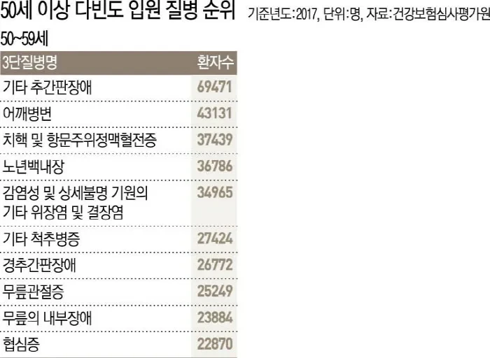 50대는 신체의 여러 변화가 일어나는 시기예요. 이 시기에 가장 많이 발생하는 질환으로는 당뇨병, 고지혈증, 고혈압 등이 있어요. 이 외에도 어깨병변, 추간판장애 같은 근골격계 질환도 많이 발생하죠.