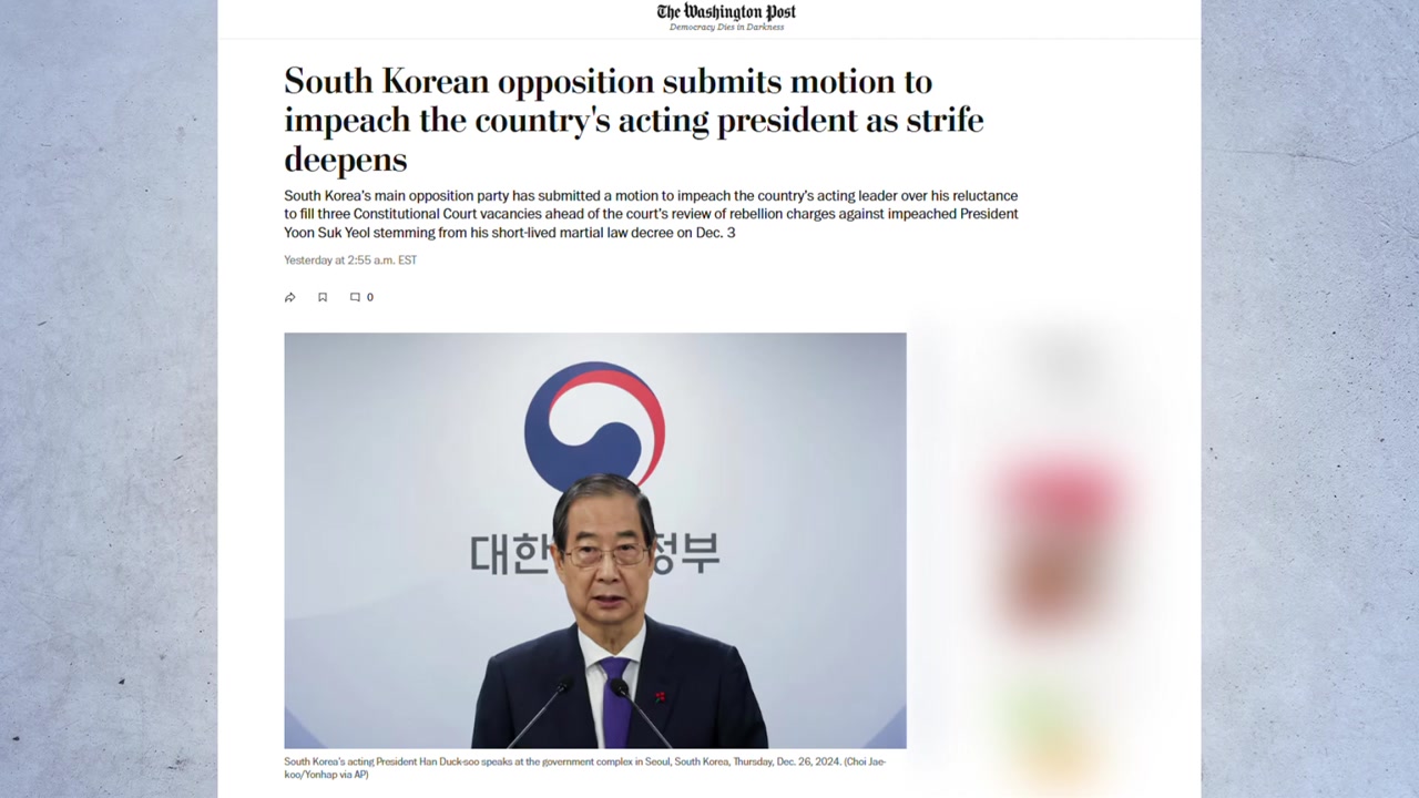 [1] KBS 뉴스 - 외신, '한 권한대행 탄핵소추안 발의'에 “한국 정치 위기 심화” (https://news.kbs.co.kr/news/view.do?ncd=8139569)