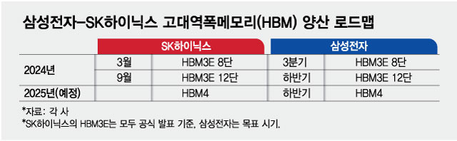 이 로드맵은 삼성전자와 SK Hynix의 HBM 생산 계획을 비교하고 있어요.