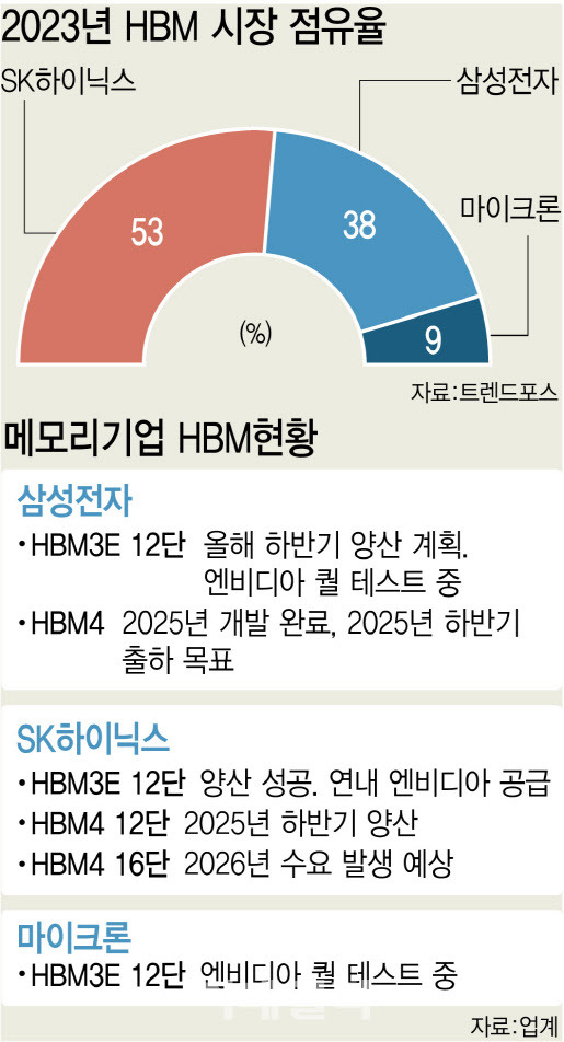 HBM 시장은 현재 SK Hynix가 53%의 점유율을 차지하고 있으며, 삼성전자가 38%, Micron이 9%를 보유하고 있어요.