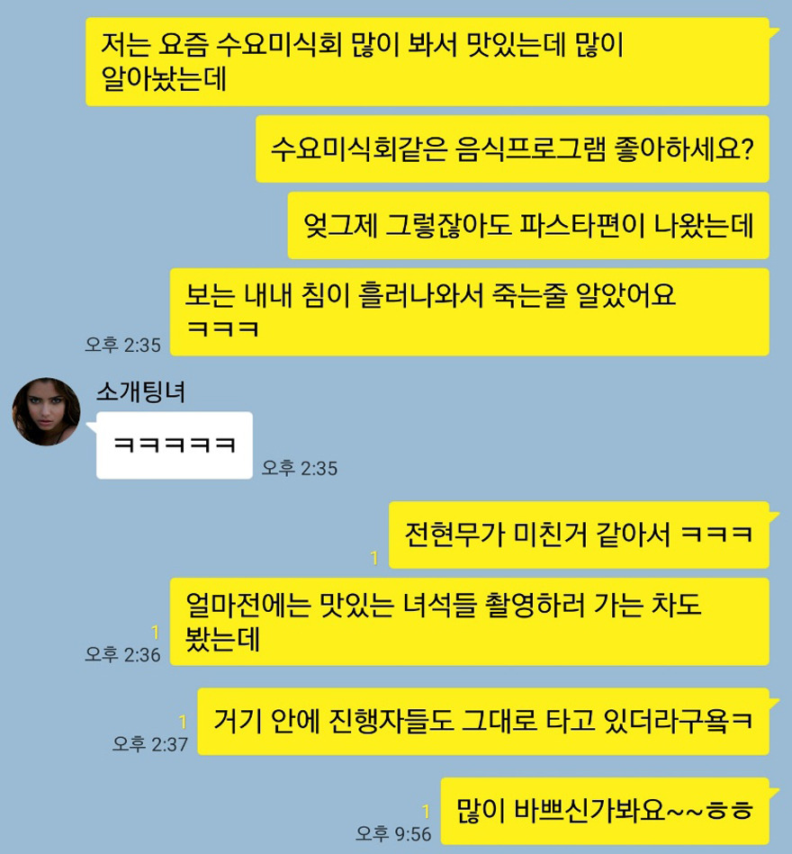 [1] 네이버 블로그 - 소개팅 대화 주제 및 소개팅 대화법 - 네이버 블로그 (https://m.blog.naver.com/lchoon123/222329081372)
