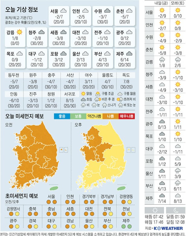 오늘은 전반적으로 흐린 날씨가 지속될 것으로 보이는데요. 특히 서울과 인천 지역은 기온이 영하로 떨어져서 매우 춥게 느껴질 것 같아요. 반면에 부산은 조금 더 따뜻한 날씨를 보일 것으로 예상되네요.