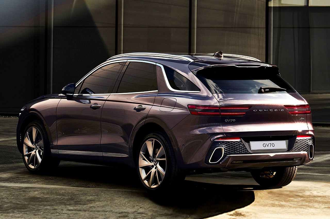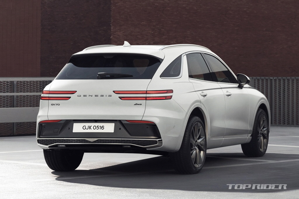 GV70의 외관은 정말 매력적이에요. 특히 후면에서 바라보면 세련된 라인과 함께 독특한 테일램프 디자인이 눈에 띄어요.