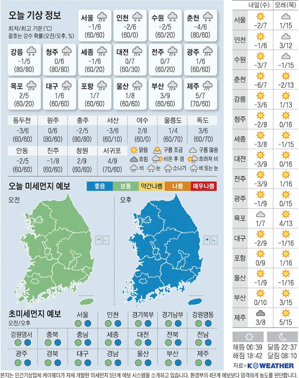 오늘의 날씨를 정리해보면, 전국적으로 흐리고 비 또는 눈이 내릴 것으로 예상되며, 특히 서울과 강원 지역에서는 눈이 내릴 가능성이 높아요. 외출 시 따뜻한 옷과 우산을 챙기는 것이 좋겠어요. 오늘 하루도 안전하고 건강하게 보내세요! ☔️