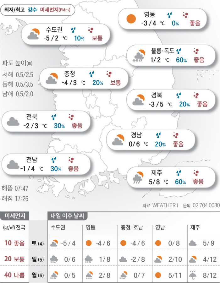이 날씨 맵을 보면, 강원도 강릉은 -14도, 춘천은 -2도까지 내려간다고 하니, 따뜻한 옷을 챙기는 것이 좋겠어요.