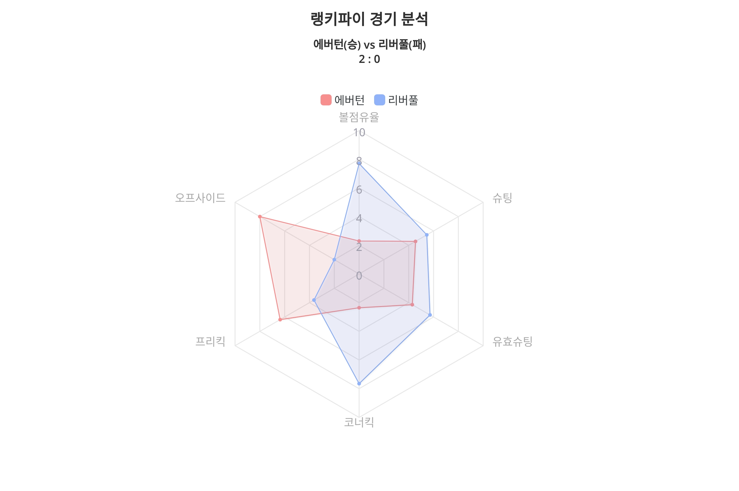 리버풀은 이번 경기에서 전반적으로 우세한 모습을 보였어요. 불점유율, 슛팅, 유효슛팅 등 여러 통계에서 에버턴을 압도했죠. 특히, 리버풀의 불점유율은 65%에 달했으며, 슛팅 수에서도 15회로 에버턴의 5회를 크게 앞섰어요.