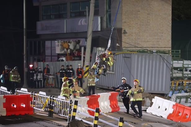 사고 현장의 모습으로, 구조대원들이 긴급히 작업을 진행하고 있는 모습이에요.