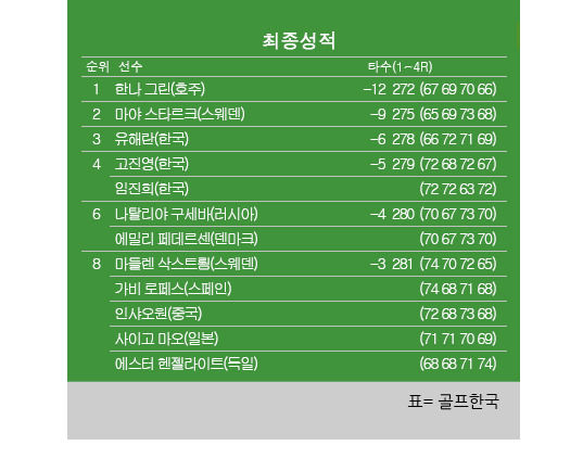 [2] 골프한국 - [LPGA] JM이글 LA 챔피언십 최종순위…한나 그린 우승, 유해란 ... (https://golfhankook.hankooki.com/news/articleView.html?idxno=20010992)