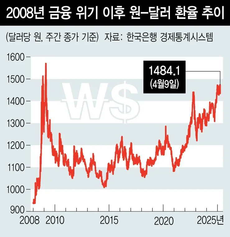 이 그래프는 2008년부터 2025년까지의 원/달러 환율 변동을 보여주고 있어요. 2010년경에 큰 폭의 상승이 있었고, 이후로는 점진적인 상승세를 보이고 있죠. 현재 환율은 1,484.1원으로, 최근의 하락세와는 대조적이에요.
