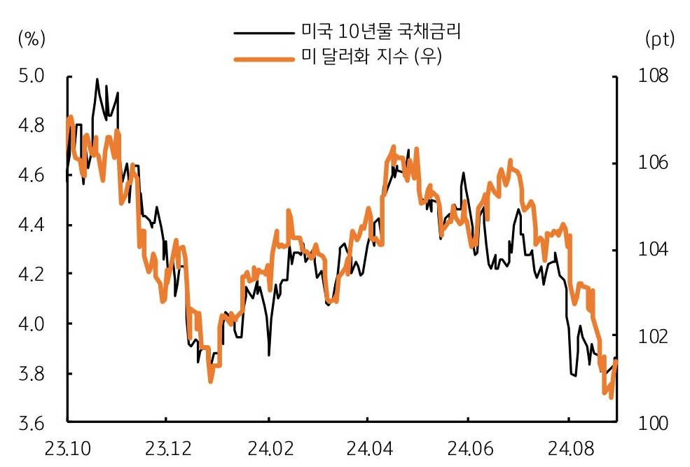 이 그래프는 미국 10년물 국채 수익률과 달러 지수를 보여주고 있어요. 두 지표 모두 하락세를 보이고 있어, 원화 강세에 긍정적인 영향을 미칠 수 있어요.