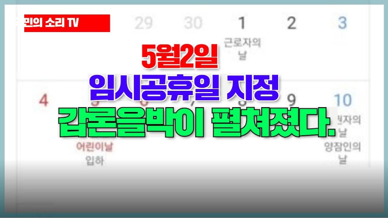 [4] KBC광주방송 - "5월 2일 임시공휴일 지정하나?"..최대 6일 '황금연휴'에 기대감 (https://www.ikbc.co.kr/article/view/kbc202504230022)