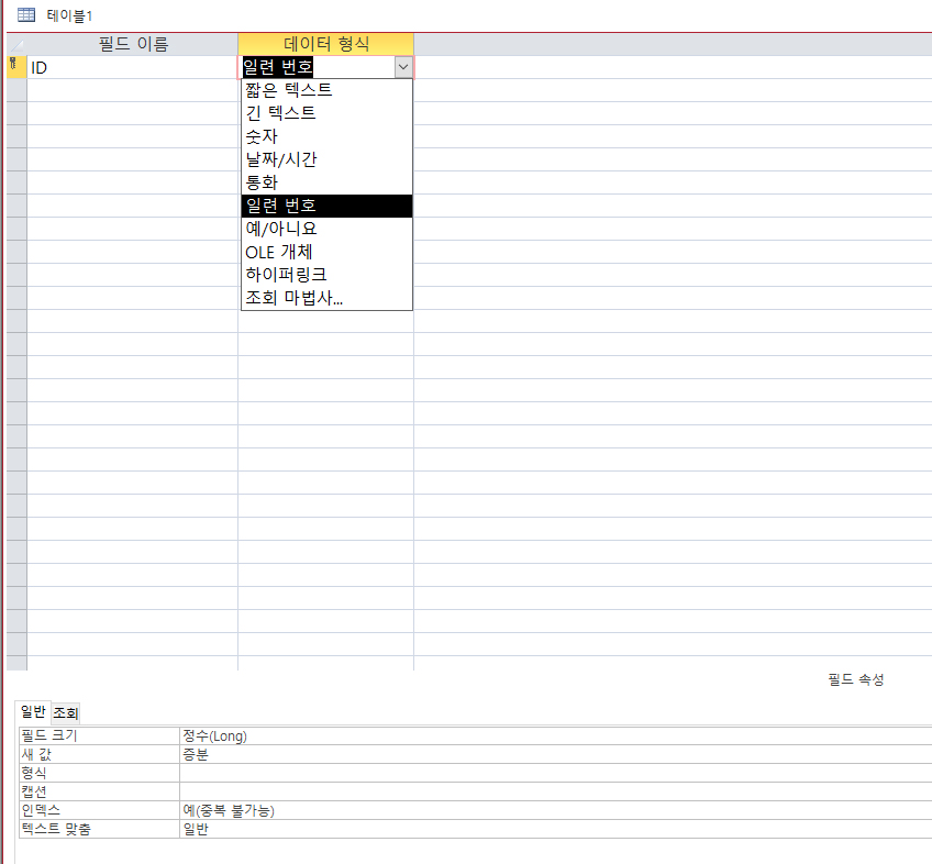 - 정수, 소수 등의 숫자 데이터를 저장할 때 사용합니다. 필드 크기에 따라 바이트, 정수, 싱글, 더블 등으로 세분화됩니다.