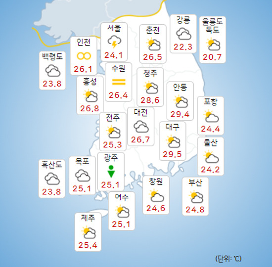 각 지역의 날씨를 살펴보면, 서울은 맑고 기온이 25도, 부산은 맑고 기온이 30도, 대전은 구름 많음으로 기온이 28도 정도예요. 이렇게 지역별로 날씨가 다르니, 외출 계획이 있다면 미리 확인하는 게 좋겠어요.