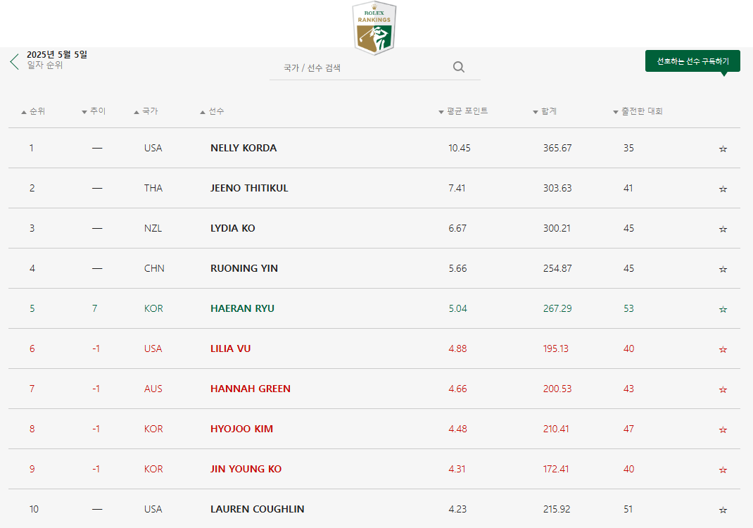 [1] Rolex Rankings - 롤렉스 여자골프세계랭킹 (https://www.rolexrankings.com/ko/rankings)