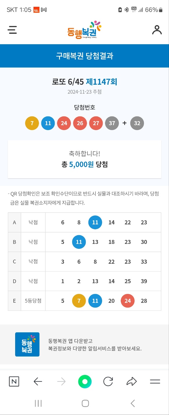 제가 지난주 추천드린 번호중 담첨은 5000원짜리 하나 맞았네요