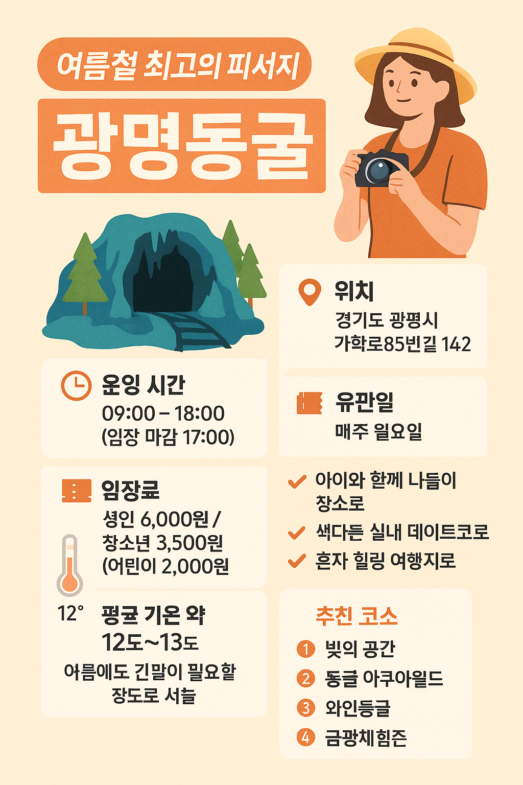 연일 이어지는 폭염, 바닷가도 좋지만 사람 많고 준비도 번거롭죠. 그런 분들을 위한 최적의 피서지가 있습니다. 바로 수도권 한복판, 경기 광명시에 위치한 **‘광명동굴’**입니다.