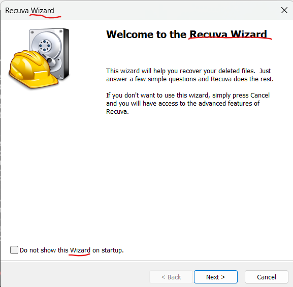 Recuva 실행 시 **복구 마법사(Wizard)**가 자동으로 시작됩니다.