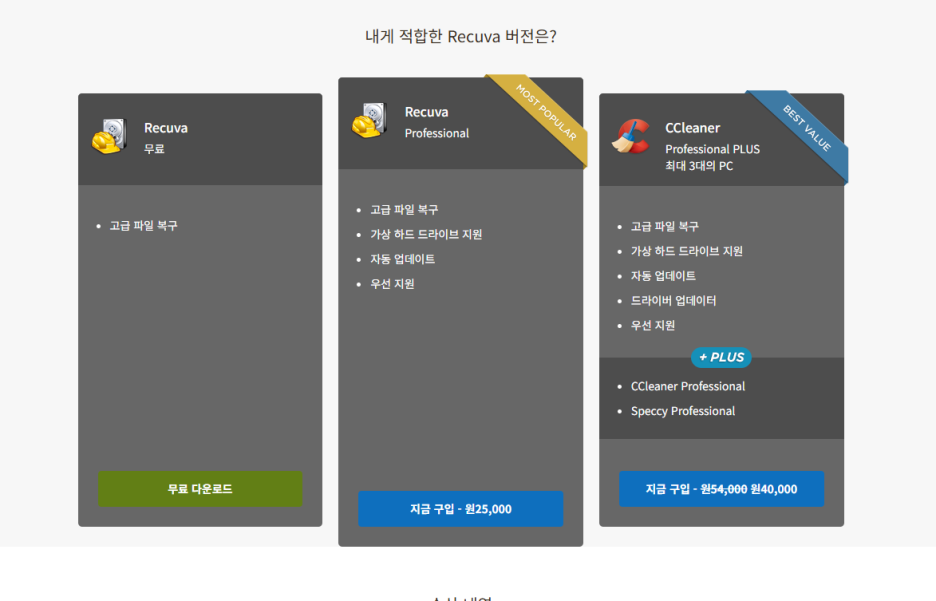 Recuva는 무료로 제공되는 Free 버전만으로도 대부분의 복구 작업을 수행할 수 있습니다. 기본적인 파일 복구 기능은 무료 버전만으로 충분하지만, 가상 하드 드라이브(VHD) 지원, 자동 업데이트, 우선 지원 등의 고급 기능이 필요한 사용자라면 Pro 버전을 선택할 수도 있습니다.
