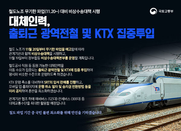 철도노조 무기한 총파업 돌입, 철도노조 파업 개요, KTX와 수도권 지하철 전동열차, 화물열차의 운행에 차질 (1) | 2024.12.05 |