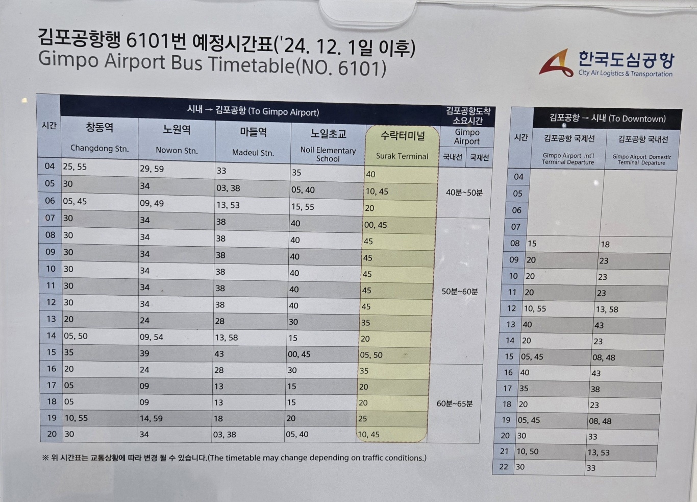 6101 번 공항리무진 버스 시간표가 변경되었네요