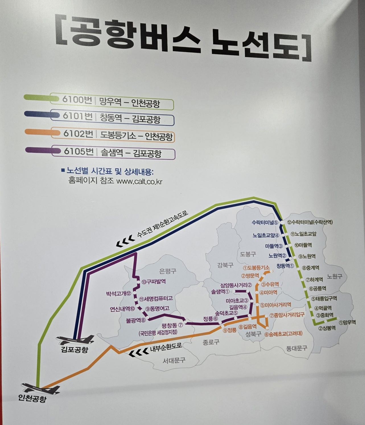 6100 도심공항리무진 시간표 , 인천공항 - 상봉, 중화, 먹골, 태릉, 공릉, 하계, 중계, 노원, 마들,