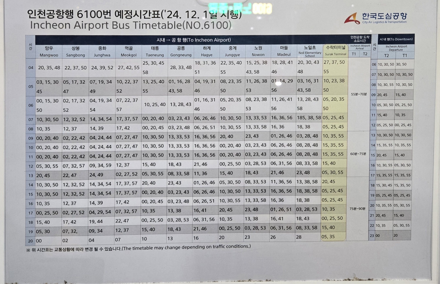 6100 번 공항리무진 버스 시간표가 변경되었네요